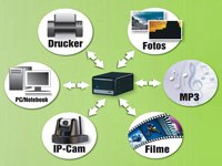 4in1 WLAN Media-Server mit Printserver und IPCam-Streamer - Multi-Server mit Live-Stream, IPCam-Backup & Downloads ohne PC Beschreibung